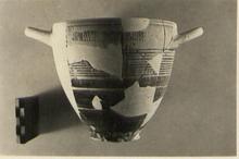 | Description: | About one-half of body preserved wth stump of one handle and a small part of the rim. Restored in plaster. Glazed to zone of fine bands, with two reserved lines; otherwise decorated as P 7149 and P 7150. Attic clay; outside, red to brown glaze; red inside. ADDENDA P 7149: ... rays, fine bands, and vertical lines and zigzags in handle zone. A zone of narrow bands below the rays. | |