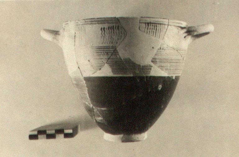 | Description: | Restored in plaster. Body fragments and greater part of both handles missing. Low ring foot; otherwise similar to P 7149 in shape and decoration. Black glaze inside, with triple reserved line at lip. Black to brownish glaze outside. No reserved bands on lower body. ADDENDA P 7149: Similar to P 7142 and P 7143 in shape (except with low flat base instead of ring foot) and in decoration; i.e., rays, fine bands, and vertical lines and zigzags in handle zone. A zone of narrow bands below the rays. P 7142: Ring foot. Large rays around bottom; then fine bands to handle zone. In handle zone, vertical bands, interrupted at the middle on each side by short vertical zigzags.... rays, fine bands, and vertical lines and zigzags in handle zone. A zone of narrow bands below the rays. | |