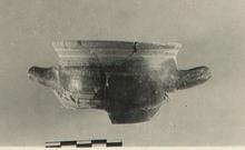 Description:   Base and most of one side missing. Dull black glaze, somewhat peeled, to lip. Two reserved bands inside lip and two outside; on edge, band with dots.