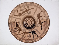 | Description: | About half preserved, with gaps. Restored in plaster. Low ring foot and deep convex side; no handles. Underneath, two glazed rings and Maltese cross. On body, procession of lions left, their feet toward the rim; part of three preserved (face of one on a small non-joining fragment). Filling ornament; loops and vegetal motif, parallel zigzags; dotted running dog. On rim, double-curved lines. Inside black glaze; reserved band at rim with series of strokes; at one point, shallow depression with black glaze, for pouring(?). | |