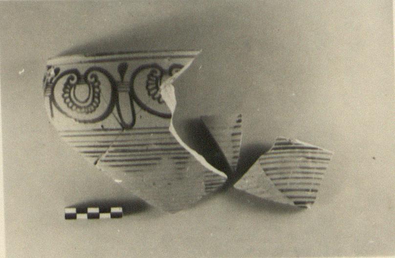 | Description: | Fragments of a krater similar in shape to P 7173, but smaller. None of base preserved. Fine bands to handle zone; in handle zone, floral pattern. Stroke series on rim. Glaze brownish-black; solid red inside. ADDENDA P 7173: Very low straight rim flat on top, and decorated on top with stroke series. | |