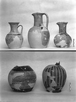 | Description: | About one-third of body, upper part of neck, handle and mouth missing. Restored in plaster. Low base. Melon-shaped body, decorated with vertical glaze bands. Neck apparently glazed solid. Dull pink clay; dull black glaze. | |