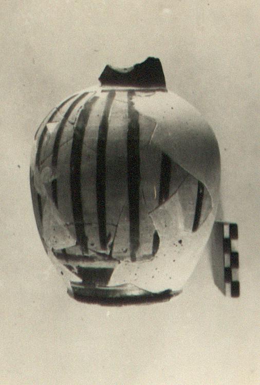| Description: | About one-third of body, upper part of neck, handle and mouth missing. Restored in plaster. Low base. Melon-shaped body, decorated with vertical glaze bands. Neck apparently glazed solid. Dull pink clay; dull black glaze. | |