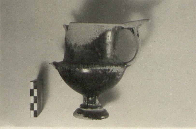 | Description: | One handle and bits of lip missing. Restored in plaster. Moulded base with scraped groove underneath and another around. Thumb-rests on handles. Dull black glaze, somewhat peeled. | |