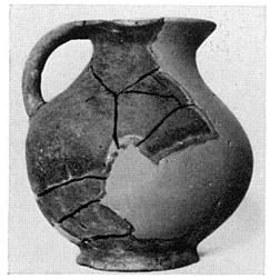 | Description: | Part of lip and much of wall gone, but the profile complete. Restored in plaster. Trefoil mouth, small vertical handle, flush with rim. Profile one continuous curve from lip to low foot ring, without break at neck or shoulder. Coarse brown clay, full of mica, and small pebbles. Handmade; thin fabric, unglazed. | |
