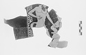 Description:   Portions of the upper part only preserved, with about one-third of the rim and parts of both figured panels. Severely burnt, one side more than the other. Glazed inside except under shoulder; rim glazed on flat top; concave overhanging outer edge reserved, and decorated with an ivy band. The attachments of one handle preserved. Borders: above panels, tongue patterns; at sides, ivy bands.