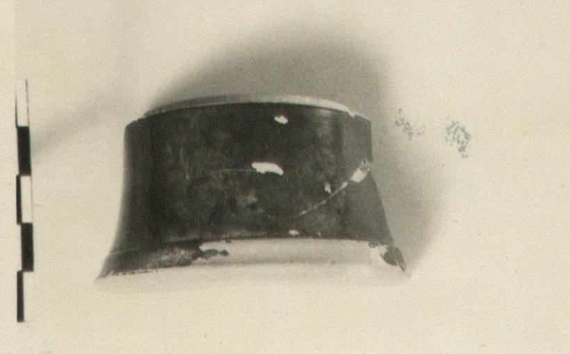 | Description: | Half preserved. Flat bottom and very slightly concave side wall, tipped a little inwards. Plain concave moulding around bottom. Flange on inner side of rim to receive lid. Good black glaze, slightly peeled, inside and out. The bottom, and the rim save for the inner edge, reserved. | |