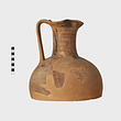 | Description: | Base and lower part of body and handle missing. Several small fragments do not join. Straight neck and trefoil mouth. On body, triple reserved bands, and a band of linked concentric semicircles on shoulder. Two more similar bands at upper and lower edges of neck. Between, hatched maeander, left. In panel on front below neck, five dotted concentric circles. On edge of lip, vertical hatching. Bluish-black glaze, peeled. | |