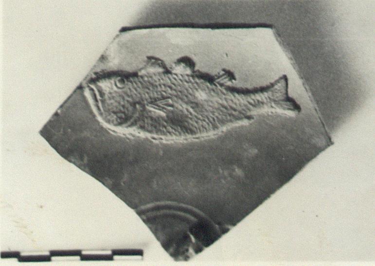 | Description: | Part of center and side of a bowl, broken all around. Very low flat base. Two concentric grooves around center of floor, and within them remains of a moulded figure. On the side, a large fish, left, with three dorsal fins. Red clay, red slip. Late Roman A. | |