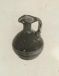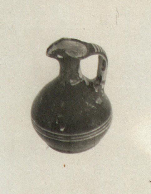 | Description: | Low ring base; squat pear-shaped body; very small neck; trefoil lip. Glazed all over outside save barred handle and triple stripe around point of greatest circumference. Attic clay. Brownish-black glaze. Similar pieces seem to be later than this example (AM 18 (1893), pl. VIII, 2, no. 10; CVA Pays Bas, 1, II F, pl. II, no. 3). Descendant of shape with panel with zigzags on neck. | |