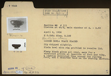 Description:   Handleless lekanis. Lip chipped slightly. Plain bowl with rim profiled to receive lid. Flaky black glaze over all, save for a scratched groove at junction of foot and body, a lightly scratched line around the flaring foot, and a reserved band on the resting surface.