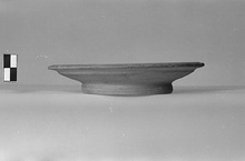 Description:   Lip chipped. Horizontal rim with two grooves. Ring foot. Floor only, covered with thin red glaze.