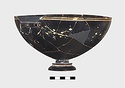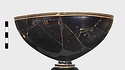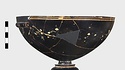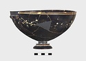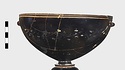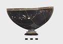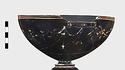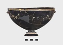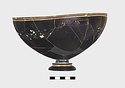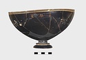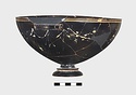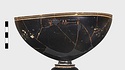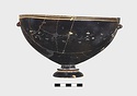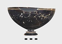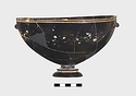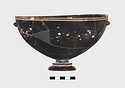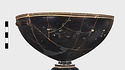 | Description: | Mended from many pieces; a few small fragments of the wall, and one of the lip, missing. Open hemispherical bowl on tall moulded foot. Beneath lip on outer wall, two grooves. Beneath these grooves, on opposite sides of the pot, moulded lugs. Around the wall an elaborate grapevine garland in applied clay; above the vine, a painted inscription, spaced around the vase: Δ Ι Ο Ν Υ Σ Ο Υ Glossy black glaze, scratched from grooves beneath lip, and from one around and one under foot. Traces of stacking on floor. | |