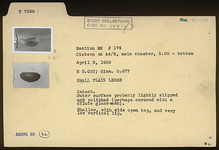 | Description: | Intact. Outer surface probably lightly slipped and polished (perhaps covered with a dilute glaze wash). Shallow, with wide open top and very low vertical lip. | |