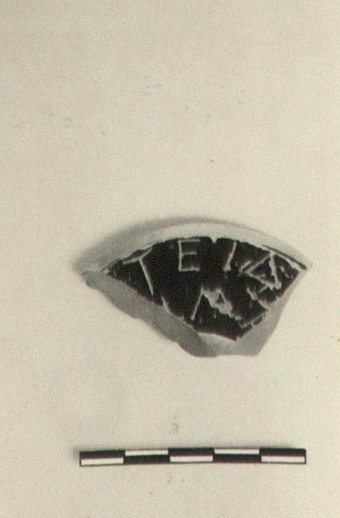 | Description: | Part of a kylix base, black glaze, the edge of the foot reserved. Inscribed on upper part: <graphic> | |
