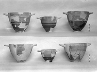 | Description: | Fragmentary. Both handles missing. Restored in plaster. Ring foot; above, wide and narrow bands. Rays, some filled with white, and shorter hooked rays between. Fine bands to handle zone. In handle zone, vertical bands to sides, seahorse-like birds between. Inside, glazed, with double reserved band inside rim. Clay greenish-pinkish-buff. Glaze black to brownish-red. | |