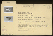 | Description: | Fragment of body and rim, with one handle. Cup with very low rim and two horizontal handles with out-turned ends set at point of greatest circumference. Bands to handle zone; in handle zone, vertical bands and a procession of birds to right. Bands on rim; glazed inside. | |