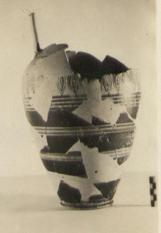 Description:   Mostly preserved to shoulder; filled out with plaster. The lower half of an amphora similar to P 7491 (ΠΘ 1295). Ring foot. Glazed to point of greatest circumference with sets of stripes; reserved bands from shoulder probably same as the above. Preserved, a band of concentric petals. On handle, horizontal bands and triple vertical wavy lines.