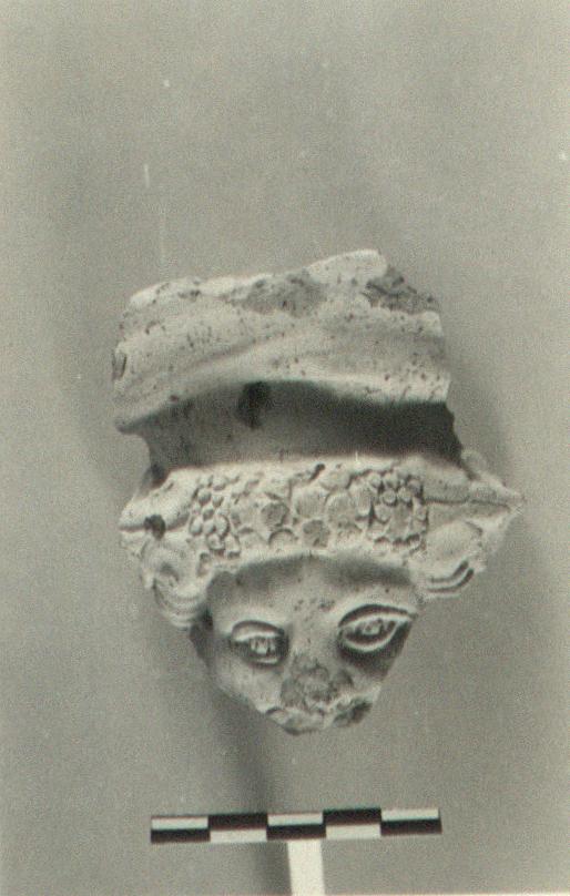 | Description: | Rim fragment, preserving slightly flaring lip with top surface sloping in. Below the lip, the upper part of a head with crown of berries and leaves preserved. Coarse red clay; yellow slip. | |