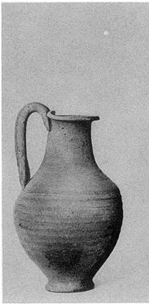 | Description: | Ring foot and round mouth with projecting lip grooved on the top, and indented at the handle attachment. Shallow grooves to shoulder; handle grooved. Pinkish-buff clay; buff surface; unglazed. | |