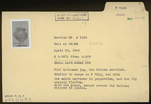 | Description: | Flat-bottomed jug, the bottom smoothed. Similar in shape to P 7533 (ΠΘ 1354), but with the mouth narrower in proportion and the lip sharply flaring. Good red glaze, except around the bottom; chipped in places. | |