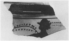 Head and shoulders of figure with branches on either side, on white ground; red used for fillet on crudely indicated head.