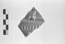 | Description: | Piece of Western Sigillata bowl; broken all around, but preserved to just below lip. A male head with flowing hair, facing right, applied on the rim. On the side wall, separated from the rim by a projecting ridge, a band of dots with tongues below; a bit of relief pattern below this. On the inside, a groove below the lip, and a ridge, set off by two grooves, at junction of wall and rim. Glaze slightly chipped. | |