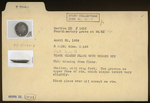 | Description: | Chip missing from floor. Shallow, with ring foot. Two grooves on upper face of rim which slopes inward very slightly. Black glaze over all except on rim. | |