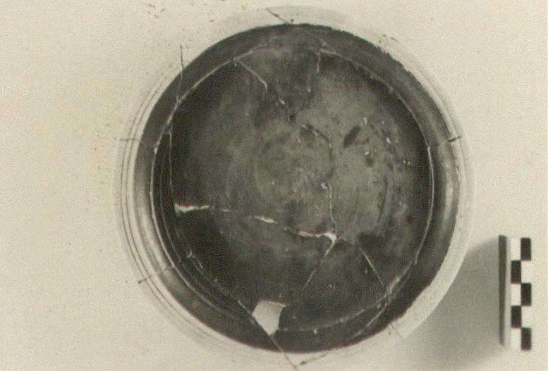 | Description: | Chip missing from floor. Shallow, with ring foot. Two grooves on upper face of rim which slopes inward very slightly. Black glaze over all except on rim. | |