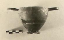 | Description: | Pieces missing from rim and wall; a chip from the base. Walls drawn in at base and lip. Ring foot, flaring above, rounded below; inside reserved, with pink wash, and circles in thin glaze. The handles long and slender. Glaze black to russet, with much evidence of burning, and a stacking line around the body. | |