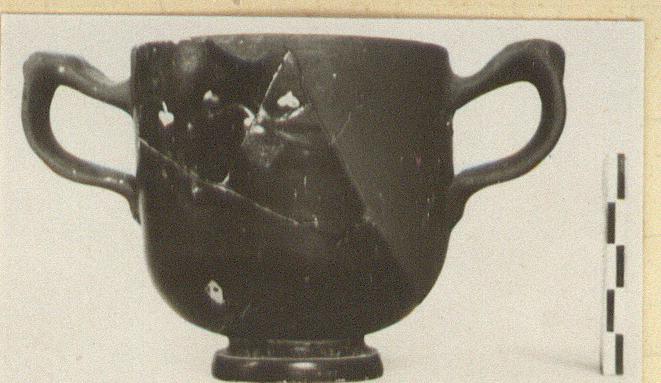 | Description: | Profile complete; vertical handle missing, and more than half of wall. Restored in plaster. High moulded ring foot; single ivy wreath below rim, in thinned clay paint. Good black glaze. | |