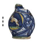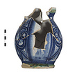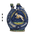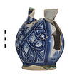 | Description: | Base preserved; most of walls and a fragment of rim; nothing of handle. A bulbous trefoil-lipped pitcher on a slightly spreading flat base. Decoration of lattice-like designs, with scrolls interwoven, in blue and white. On the side is a large medallion, the background dark blue with segments of green and orange. In the center, a brown and white dog, leaping left. On lip and base, green glaze with narrow bands of brown. Inside, glazed with palest bluish-white; outside, transparent glaze over the colors noted. Bottom unglazed, has graffito: <graphic> Coarse light buff clay. | |