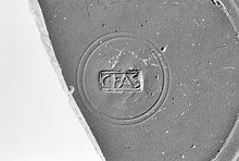 | Description: | Part of the bottom of a Western Sigillata dish. Rays lightly impressed beneath. Ring foot with angular profile. In center: <graphic> | |
