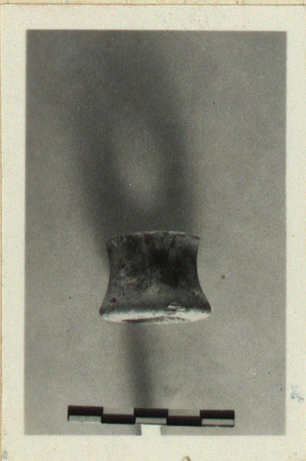 | Description: | High concave sides, flaring below. Traces of thin glaze, spilled on(?). Heavy fabric, pale grenish to pinkish buff clay. Pot stand? Cf. MC 201. | |
