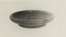 | Description: | Low foot, slightly rising; thick rim. Pinkish clay. Mottled red to black glaze, somewhat chipped. Resting surface unglazed. | |