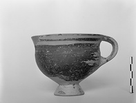 | Description: | Chips missing from lip. Small conical foot; flaring lip; handle from lip to middle of wall. Bands on handle and rim. Interior glazed save for a reserved line along the edge of the lip and a central dot on the floor. Exterior glazed to within a short distance of foot. Lower body and foot unglazed. Glaze dull black, somewhat peeled. | |