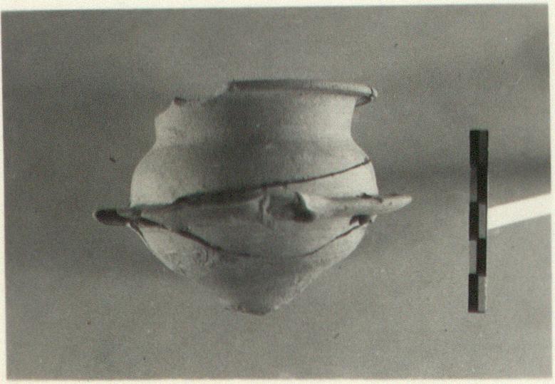 | Description: | Foot, handles and part of wall missing. Deep bowl with horizontal keel at mid-height and flaring rim. Horizontal handle on either side with a hole pierced through keel on each side of handle. Pale yellow clay, no paint. | |