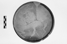 Description:   Chip missing from lip. Restored in plaster. Massive profile. Torus lip. On floor double circle of rouletting with a small incised circle in the middle.