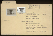 | Description: | Much missing from wall. Restored in plaster. Straight flaring side wall. Horizontal rim. Handles pressed close to rim. Thin brown glaze on inside only. | |