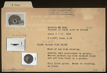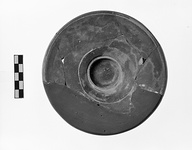 | Description: | Much of one side missing. Restored in plaster. Central wall surrounded by groove. Narrow pendent lip with outward flare set off from floor by a groove. Thin black glaze. Marks of stacking on floor. | |