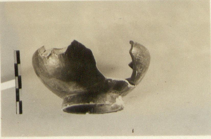 | Description: | Handle and much of wall missing. Deep bowl with incurved rim. In floor, ten large holes made by potter. Traces of vertical loop handle. Firm black glaze. Cf. P 2866. | |