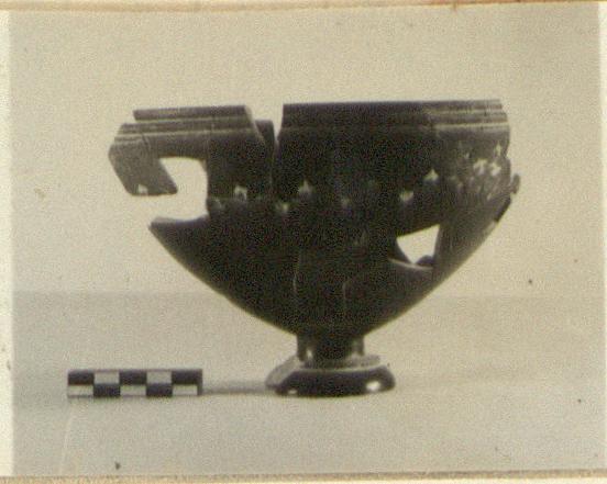 | Description: | Handles and much of wall missing. Hemispherical bowl. High profiled foot. Two grooves below lip on outside. Suspended between the handles on either side, an ivy garland. Glossy black glaze, scratched from lines around foot and from bottom of rim grooves. | |