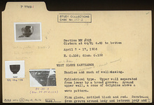 | Description: | Handles and much of wall missing. Restored in plaster without handles. Cylindrical type. Upper wall separated from lower by a broad groove. Around upper wall, a zone of dolphins above a wave pattern. Firm glaze, mottled black and red, scratched from groove around body and at junction of body and base. | |