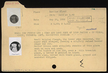 | Description: | Small bulging flange, the lower edge reserved, the upper edge scraped, forming a slightly raised border around the lid. Head and long neck of lion facing. In field right, thyrsos; left, concentric circles. Relief lines; neck stippled; remains of thin glaze wash on ears and neck. On the inside of the lid, over a thin brownish glaze, a letter Σ (<graphic>) painted in black. Attic clay. Rather dull black glaze, grayed and somewhat chipped. | |