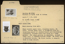 | Description: | Much missing from wall; restored in plaster. High concave upper wall, slightly inset. No foot. No handles. Around upper wall, a broad zone with alternating panels of checkerboard and diminishing rectangles, bordered above and below by a deep groove. Two other grooves on shoulder. Around lower wall, a lightly incised calyx. On underside a wheelrun circle. On floor inside, a woman's head in high relief. Flaky black glaze. | |