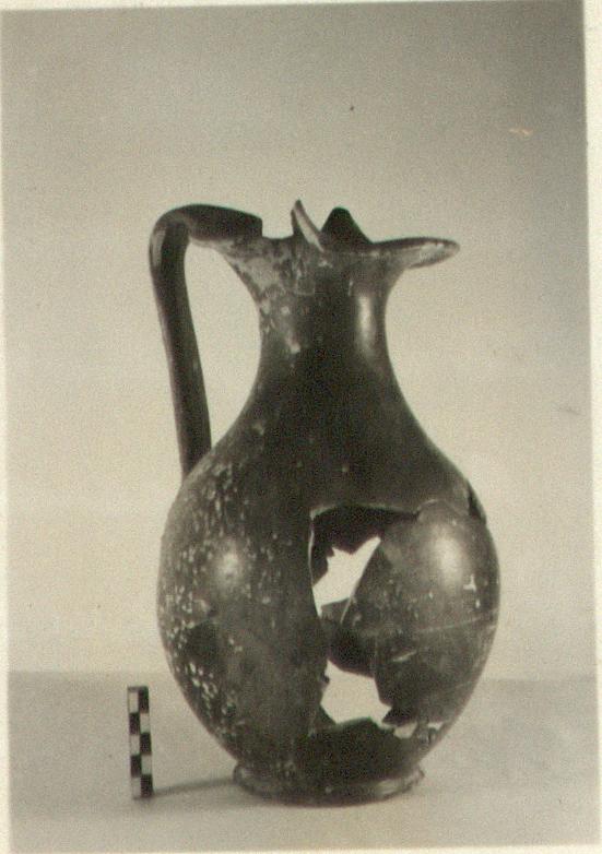 Description:   Fragments missing from wall. Restored in plaster. Slender neck. Two-lobed mouth with broad flaring lip.