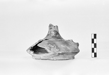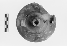 | Description: | Mouth, handle and part of wall missing. Flat bottom, sharply angular side wall. Vertical ring handle set on shoulder. Around shoulder, an ivy wreath. | |