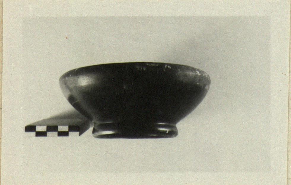 | Description: | Plain bowl with ring foot and sharply inturned rim. Good black glaze all over; traces of stacking outside. Cf. P 2863, P 7191, P 7748, P 29229. | |