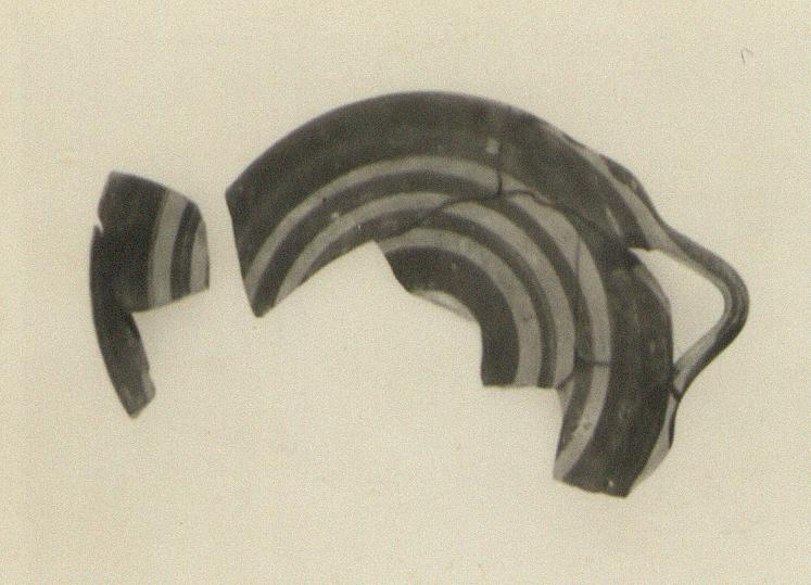| Description: | Mended from four fragments; about half preserved, with one handle; another piece (two fragments) does not join. Ring foot; loop ribbon handle. Concentrically striped; stripes in thin streaked glaze. Underside unglazed. Attic clay, pink to gray. | |