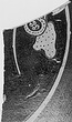 Description:   Most of rim and one handle preserved; little of floor. Offset rim. Of the medallion, framed by a single reserved line, remains only, at left, a heel, right, and the end of a staff(?); at right, an aryballos, sponge and strigil(?).